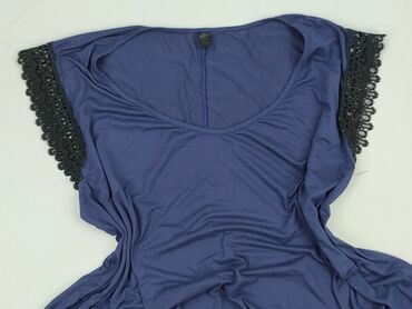 Bluzka damska w kolorze granatowym, rozmiar XL. - Krój: luźny, z okrągłym dekoltem; subtelne zakładki z przodu. - Rękawy: krótkie, wykonane z ażurowej koronki o kwiatowym wzorze. - Materiał: lekki...