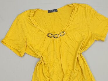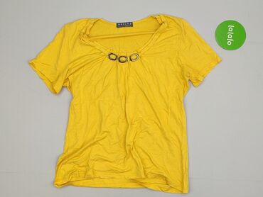 Żółta bluzka damska z krótkim rękawem, o asymetrycznym kroju, z zaokrąglonym dekoltem. Wykonana z materiału z dodatkiem elastanu, zapewniającego wygodę noszenia. Bluzka posiada metalowe ozdobne kół...