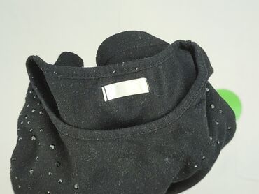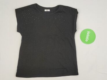 Czarna damska bluzka z krótkim rękawem ozdobiona drobnymi, błyszczącymi dżetami na przodzie. - Fason: dopasowany, długość do bioder - Dekolt: głęboki, zaokrąglony z lekko stojącą stójką - Rękaw: k...Stan: