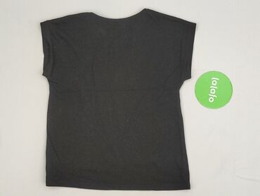 Czarna damska bluzka z krótkim rękawem - Fason: luźniejszy, z marszczeniami przy dekolcie i na dole; dolny ściągacz lekko dopasowuje bluzkę do sylwetki - Dekolt: głęboki w kształcie litery V z sze...