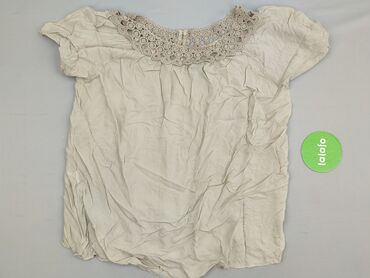 Krótki rękawBluzka damska w kolorze beżowym lub jasnoszarym, z krótkimi rękawami. Charakteryzuje się okrągłym dekoltem ozdobionym delikatną, ażurową koronką w tym samym odcieniu. Z tyłu na karku znajduje się małe rozcięcie z zapięciem na guzik, co ułatwia zakładanie. Fason bluzki jest luźny i lekki, marszczenia wokół dekoltu dodają jej objętości i zwiewności. Materiał wydaje się być lekki i przewiewny, co sprawia, że bluzka jest odpowiednia na ciepłe dni.