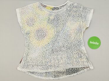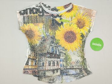 Krótki rękawBluzka damska z krótkim rękawem, lekko transparentna, o strukturze siateczki z tłoczonym wzorem przypominającym drobne plamki. Przód z barwnym nadrukiem: duże słoneczniki połączone z miejskim pejzażem/architekturą; tył jasny z subtelnym, rozmytym powtórzeniem motywu. Okrągły dekolt, delikatnie przedłużony tył, swobodny krój.