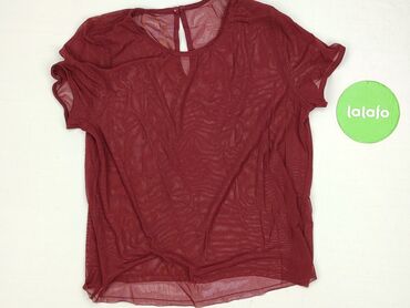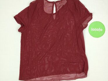 Bordowa bluzka damska z krótkim rękawem - Fason: luźny, z zaokrąglonym dołem (wydłużony tył), lekko opadające rękawki - Dekolt: w kształcie litery V z szeroką listwą - Kolor: głęboki burgund - Roz...