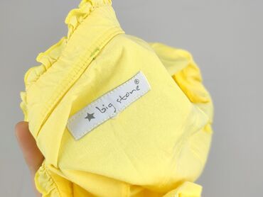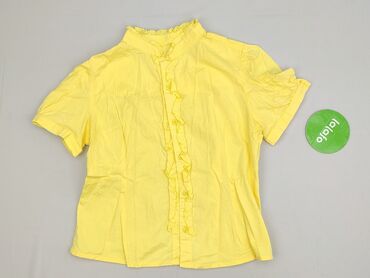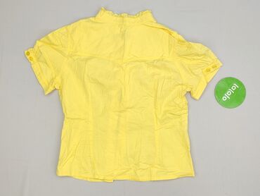 Jasnożółta bluzka damska z krótkim rękawem marki Reserved. Charakteryzuje się delikatnym, pionowym wzorem w paski oraz eleganckim kołnierzykiem. Z przodu bluzki znajduje się ozdobna falbanka wzdłuż...