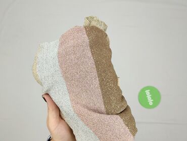 - Dzianina z połyskiem, poziome pasy w odcieniach złamanej bieli, beżu, różu i brązu