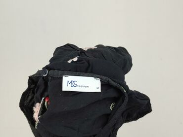 Krótki rękawCzarna bluzka damska z krótkim rękawem MDG Fashion, rozmiar M. Model z delikatnie marszczoną dolną częścią i zapięciem na guzik z tyłu przy karku. Na całej powierzchni zdobienia w postaci haftowanych kwiatów – czerwone i pudrowo‑różowe aplikacje z zielonymi listkami. Miękki, lekki materiał, dekolt okrągły, rękawy lekko bufiaste. Idealna do jeansów lub spódnic, efektowny floralny wzór.