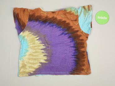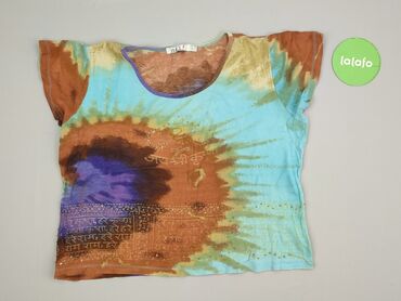 Ta bluzka damska z krótkim rękawem wyróżnia się unikalnym wzorem tie-dye w odcieniach niebieskiego, zielonego i żółtego, wzbogaconym o graficzne motywy, takie jak koła i stylizowane kwiaty. Okrągły...Stan:
