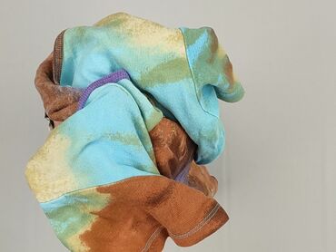 - Wzór/kolor: efekt tie‑dye w odcieniach turkusu, brązu, beżu i fioletu; z przodu nadruki inspirowane pismem orientalnym oraz drobne aplikacje błyszczących koralików/cyrkonii