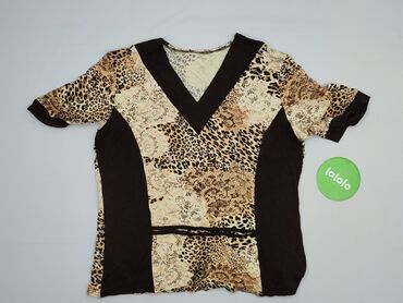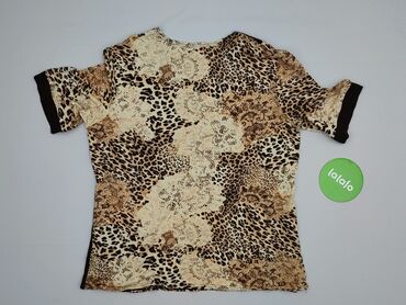 Bluzka damska W@W, rozmiar L - Krój: taliowana, z krótkim rękawem - Dekolt: w serek z kontrastową, brązową lamówką - Wzór: beżowo‑brązowy, inspirowany motywem zwierzęcym/kamienną mozaiką - Materia...