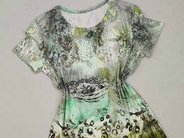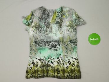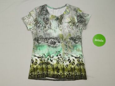 Bluzka damska z krótkim rękawem, ozdobiona wzorem w tropikalne kwiaty i liście. Dominują odcienie niebieskiego, błękitu, pomarańczu i bieli. Bluzka posiada okrągły dekolt. Idealna na cieplejsze dni...