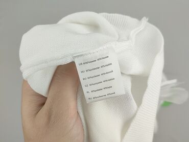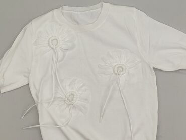 Biała dzianinowa bluzka z krótkim rękawem i okrągłym dekoltem. Przód zdobią trzy trójwymiarowe aplikacje kwiatów z płatkami i długimi wstążkami, rozmieszczone asymetrycznie (lewe ramię, prawa pierś, lewy dół). Tył gładki. Ściągacze przy dekolcie, na dole i przy rękawach.