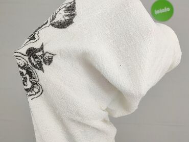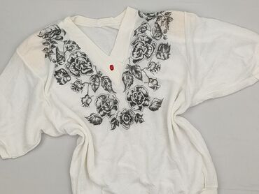 Bluzka damska z lekkiej, półprzezroczystej tkaniny w kolorze białym z kwiatowym nadrukiem w odcieniach różu, zieleni i czerni na rękawach oraz dolnym wykończeniu. - Krój luźny, swobodny - Dekolt ...