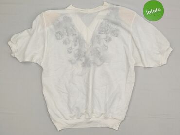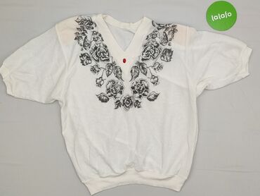 Krótki rękawBiała bluzka damska z krótkim rękawem i dekoltem w serek. Przód zdobi efektowny nadruk kwiatów (róże) w kolorze czarnym, ułożony wzdłuż dekoltu, oraz drobny czerwony akcent. Materiał cienki, miękki i lekko teksturowany, przyjemny w dotyku, półprześwitujący. Luźniejszy krój z obniżoną linią ramion, elastyczne wykończenie dołu i rękawów. Tył gładki. Idealna do stylizacji casual i retro. Dla kobiety.