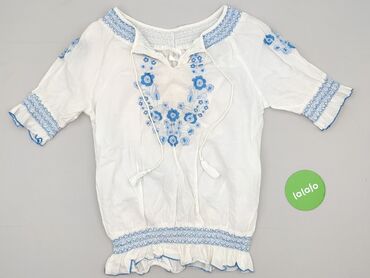 Biała bluzka boho z długim rękawem - Lekka, zwiewna tkanina w delikatną, wytłaczaną kropkę/prążek - Dekolt w kształcie litery V z troczkami do wiązania - Ażurowe, koronkowe wstawki z przodu na wys...Stan: