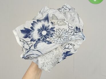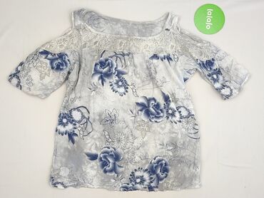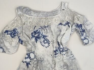 Bluzka damska z wyciętymi ramionami (cold shoulder) - Rozmiar: 36 (metka) - Kolor bazowy: jasny, pastelowy szaroniebieski - Wzór: kwiatowy – czerwone i białe kwiaty z granatowymi listkami - Krój: ...
