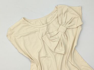 Ażurowa bluzka damska w kolorze ecru/kremowym. - Krój: luźny, z krótkim rękawem typu nietoperz. - Materiał: 95% wiskoza, 5% elastan (metka ze składem widoczna na zdjęciu). Delikatna, elastyczna dz...
