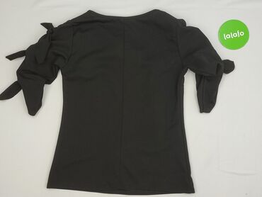Ta damska bluzka w kolorze czarnym wyróżnia się stylowym dekoltem w kształcie litery V z przodu oraz unikatowym otwarciem na plecach. Rękawy o długości do łokcia zakończone są modnymi wiązaniami, d...Stan: