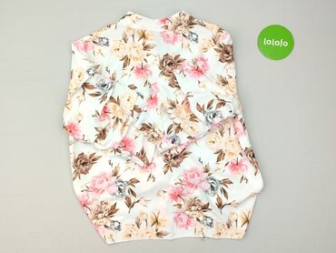 Biała, lekka bluzka damska z krótkim, opadającym rękawem. Z przodu nadruk w beżowo‑taupe kwiaty na długich łodygach. Okrągły dekolt, luźny fason typu oversize, dół z lekkim zaokrągleniem i troczkie...Stan: