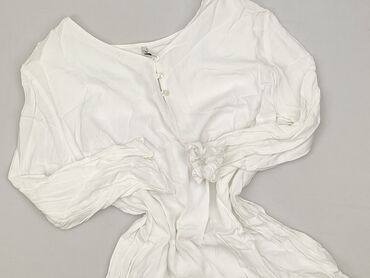 Biała koszula/bluzka damska z długim rękawem. - Krój typu tunika, luźny, z zaokrąglonym, wydłużonym tyłem. - Dekolt w serek z krótką listwą i trzema guzikami. - Na rękawach guziki do podpięcia (moż...