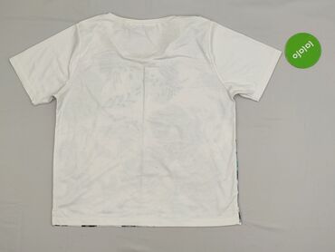 Bluzka damska z krótkim rękawem - Kolor bazowy: biały - Wzór: akwarelowe motywy kwiatów i flakoników perfum w odcieniach fioletu, różu, żółci i czerni - Dekolt: w kształcie V z krótkim rozcięciem ...Stan:
