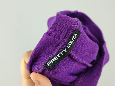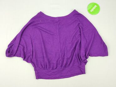 Fioletowa bluzka damska z krótkim rękawem, ozdobiona wzorzystymi, bufiastymi rękawami oraz ozdobną falbanką z tego samego materiału na przodzie. Główna część bluzki jest wykonana z gładkiego materi...Stan: