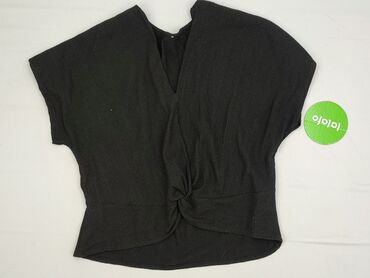 Czarna damska bluzka z krótkim rękawem - Krój dopasowany, miękko układający się na sylwetce - Dekolt w kształcie litery V z dekoracyjnym skręceniem/supłem na środku - Gładka, jednolita tkanina - M...