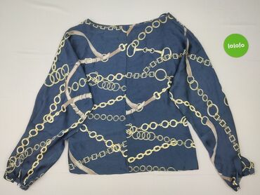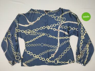 Długi rękawElegancka bluzka damska w odcieniu granatowym, ozdobiona wzorem w złote łańcuchy i paski. Charakteryzuje się luźnym fasonem, który zapewnia komfort noszenia i swobodę ruchów. Rękawy zakończone są gumką, tworząc delikatne bufki. Dekolt okrągły, bez zapięcia, co ułatwia zakładanie. Idealna propozycja do stylizacji codziennych, jak i na specjalne okazje, dodająca klasy i oryginalności.