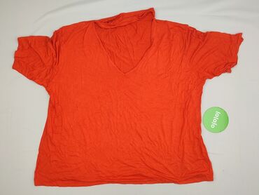 T-shirt damski w kolorze intensywnej pomarańczy. - Krój: klasyczny, z krótkim rękawem - Dekolt: w kształcie litery V - Materiał: cienka, miękka dzianina bawełniana (bez metki składu – wygląda na b...