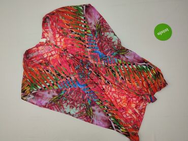 Bluzka damska z krótkim rękawem, w kwiatowy wzór, dominują odcienie czerwieni, różu i zieleni na jasnym tle. Dekolt jest zaokrąglony z marszczeniami, a dół i rękawy również posiadają marszczenia, c...