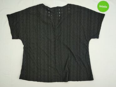 Czarna bluzka damska z dekoltem V - Krój: luźny, z krótkim rękawem - Dekolt: w kształcie litery V ozdobiony koronkową lamówką z motywem kwiatowym - Materiał: miękka, cienka dzianina (skład nie pod...