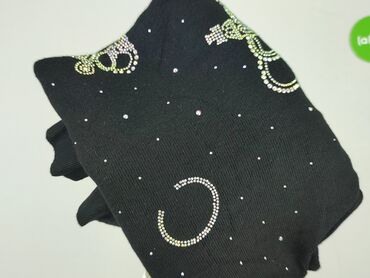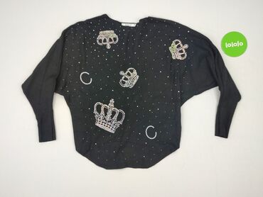 Czarna bluzka damska z dżetami - Materiał: 100% bawełna (metka) - Rozmiar z metki: 40 - Krój: luźniejszy, rękaw 3/4 - Dekolt: w kształcie litery V, obszyty dekoracyjną, połyskującą lamówką - Przód...