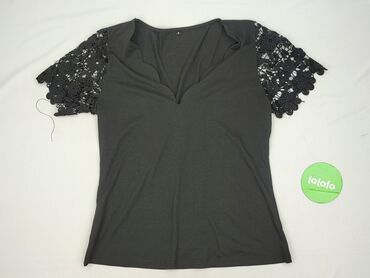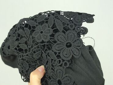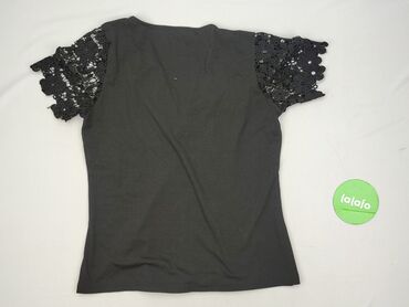 Bluzka damska w kolorze czarnym, z koronkowym wzorem. Charakteryzuje się krótkimi rękawami i dekoltem w kształcie litery V. Koronkowy materiał pokrywa przód i tył bluzki, nadając jej elegancki wygl...Stan: