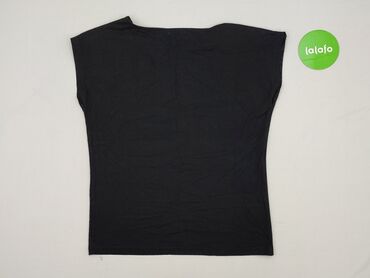 Czarna damska bluzka z krótkim rękawem, dopasowana, z ozdobą z dżetów. - Fason: lekko taliowana, elastyczna, okrągły dekolt - Rękaw: krótki - Kolor: czarny - Ozdoby: asymetryczny panel z przodu z ...