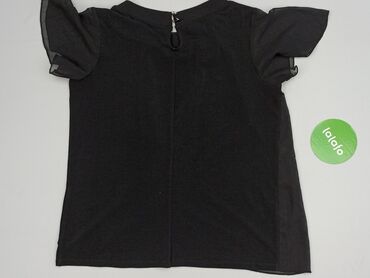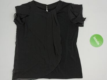 Czarna bluzka damska z krótkim rękawem - Krój: prosty, lekko wydłużony tył - Dekolt: okrągły - Rękawy: krótkie - Zapięcie: suwak z tyłu - Detale: kontrastowe, szare lamówki przy dekolcie, rękawach...Stan: