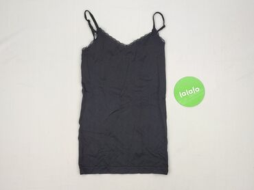 Czarny top na ramiączkach spaghetti - Krój: prosty, lekko luźny, z dekoltem w kształcie litery V z przodu i z tyłu - Materiał: cienka, miękko połyskująca tkanina o satynowym efekcie - Wykończenie:...