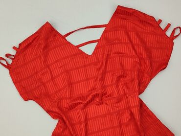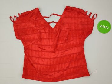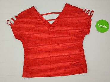 Czerwona bluzka damska z krótkim rękawem i zapięciem na guziki - Krój: lekko pudełkowy, prosty, z delikatnym dekoltem w kształcie litery V - Zapięcie: listwa z przodu na pięć materiałowych guzików...
