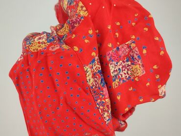 - Wzór: patchwork na intensywnie czerwonym tle – mieszanka drobnych kropek, serduszek i paneli w kwiaty (odcienie żółci, różu, niebieskiego i fioletu).