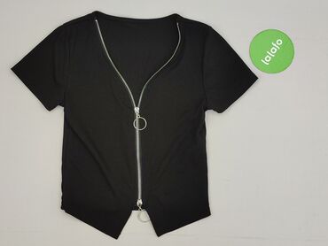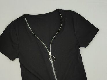 Krótki rękawCzarna, dopasowana bluzka damska z krótkim rękawem. Wykonana z prążkowanej, elastycznej dzianiny, która ładnie układa się na sylwetce. Z przodu efektowny metalowy zamek błyskawiczny w kształcie litery V, zakończony ozdobnymi kółkami przy suwaku u góry i na dole. Dekolt w kształcie V pozwala regulować głębokość rozpięcia zamkiem. Dół z lekkim rozcięciem centralnym. Gładka, jednokolorowa – łatwo łączy się z jeansami, spódnicami i ramoneską. Idealna na co dzień i wieczorne wyjścia.