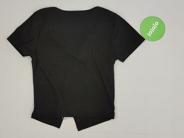 Czarna damska bluzka z krótkim rękawem - Fason: prosty, lekko wydłużony, zaokrąglony dół - Dekolt: okrągły - Detale: ozdobny pas z siateczkowej wstawki na przodzie (delikatny transparentny panel),...