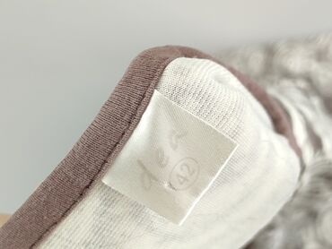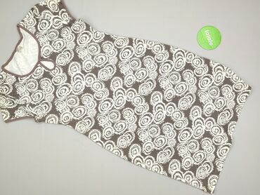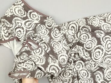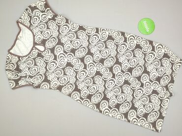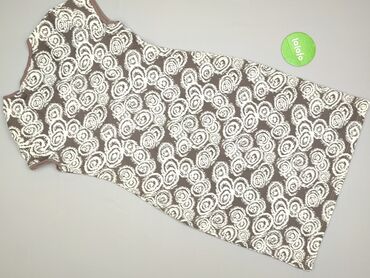 Sukienka dzianinowa z krótkim rękawem, o prostym, lekko dopasowanym kroju do kolan. - Wzór: gęsty, ornamentalny motyw w odcieniach brązu i granatu na kremowym tle. - Dekolt: okrągły. - Rękaw: krót...