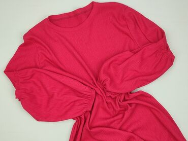Sukienka dzianinowa w kolorze intensywnego różu (fuksja). - Krój: prosta góra jak T‑shirt, dekolt w serek (V-neck), krótki rękaw. - Dół: wszyta szeroka, marszczona falbana dodająca lekkości. - Mat...Stan: