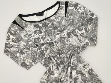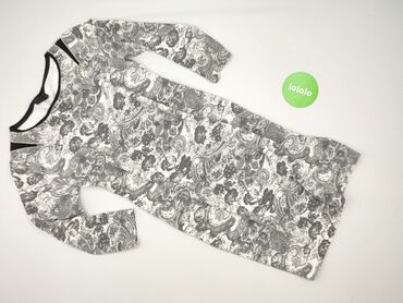 Sukienka damska midi z krótkim rękawem - Rozmiar z metki: 42 - Kolor bazy: jasnoszary - Wzór: kwiatowy – białe, koronkowo wyglądające aplikacje z ciemnymi akcentami - Fason: dopasowana, długość za...