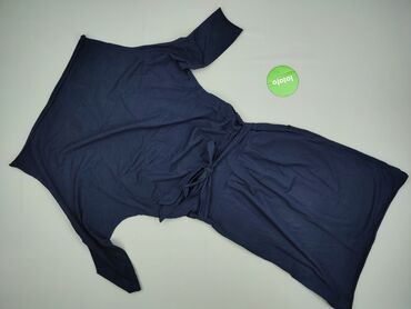 Niebieska sukienka dzianinowa z paskiem - Fason: taliowana, z szerokim pasem i dołączonym paskiem do wiązania - Rękawy: krótkie, swobodne (nietoperz) - Długość: do kolan lub przed kolano (zależnie...