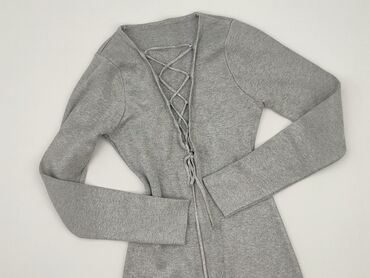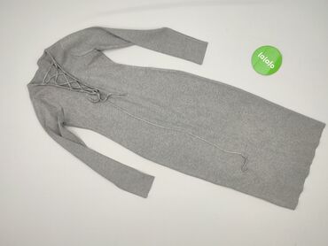 Szara, dzianinowa sukienka midi z długim rękawem. - Fason dopasowany, długość za kolano. - Dekolt z wiązaniem na sznurki i dużymi metalowymi oczkami (gorsetowe sznurowanie). - Elastyczna, prą...Stan: