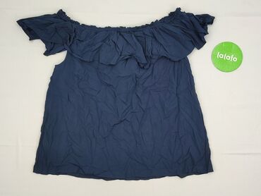Bluzka hiszpanka z falbaną, granatowa. - Krój: odkryte ramiona (off-shoulder) z szeroką, podwójną falbaną wokół dekoltu - Rozmiar z metki: M - Materiał: 65% bawełna, 35% poliester – miękki, lekko ...