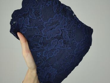 Bluzka damska w kolorze granatowym, rozmiar XL. - Krój: luźny, z okrągłym dekoltem; subtelne zakładki z przodu. - Rękawy: krótkie, wykonane z ażurowej koronki o kwiatowym wzorze. - Materiał: lekki...