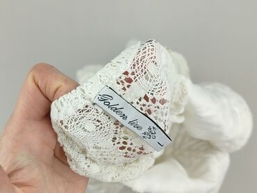Biała sukienka boho na ramiączkach „Made in Italy” - Zwiewny, plisowany krój z miękkiej, lekkiej tkaniny. - Dekolt i ramiona zdobione ażurową koronką z kwiatowym motywem oraz perełkami. - Asymetry...