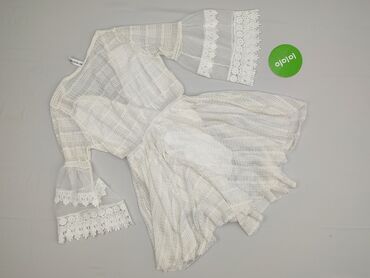 Biała sukienka mini z koronką - Krój: taliowana z elastyczną gumką w pasie, rozszerzany dół - Długość: mini - Rękawy: 3/4 z koronkowym wykończeniem - Dekolt: głęboki V ozdobiony szeroką koronkową ...