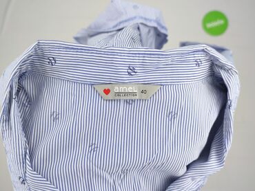Damska koszula Emka, rozmiar 40. - Krój: klasyczna zapinana na guziki, długi rękaw, lekko wydłużony tył. - Wzór: drobne granatowe kotwice na białoniebieskich, cienkich paskach – marynistyczny styl....