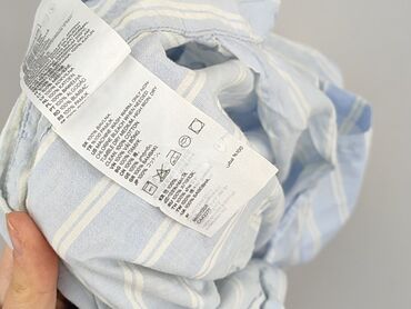Koszula damska H&M - Krój: klasyczna koszula z kołnierzykiem, długi rękaw - Zapięcie: pełny rząd guzików z przodu; mankiety na guzik - Wzór: cienkie pionowe paski w kolorze niebieskim i białym - R...